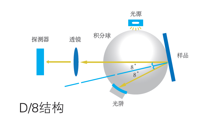 1、儀器采用國際通用的D/8(積分球漫射照明,8°觀察角)SCI照明觀測條件