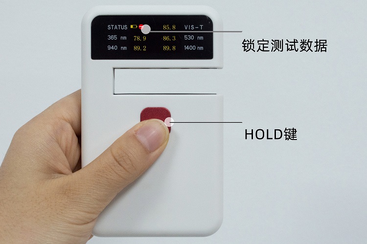 4.儀器具有數(shù)據(jù)鎖定功能,測(cè)試后按下儀器上的HOLD鍵即可鎖定測(cè)試數(shù)據(jù),拿開(kāi)測(cè)試樣品數(shù)據(jù)仍然保持在顯示界面上