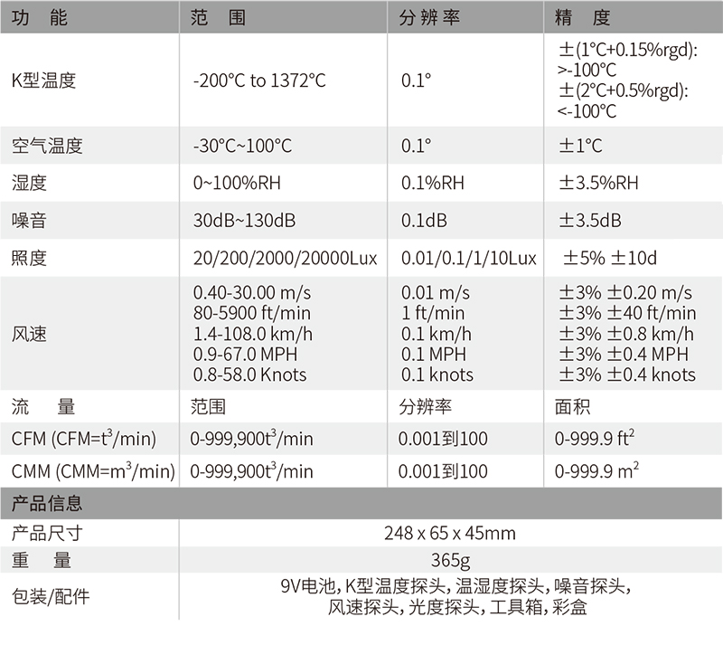 9V電池,K型溫度探頭,溫濕度探頭,噪音探頭,風(fēng)速探頭,光度探頭,工具箱,彩盒