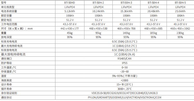 BT-50H系列家用低壓蓄電池,解決方案與 EH 和 ET 逆變器兼容。它提供了從 5.12 kWh到25.6kWh的廣泛容量范圍,提供了全面的儲能選項,以滿足從自我消耗優(yōu)化到備份使用等苛刻的系統(tǒng)要求。可堆疊的自檢模塊使系統(tǒng)特別易于安裝和維護。同時可靠的磷酸鐵鋰電池技術(shù)確保了最大的安全性和更長的生命周期。