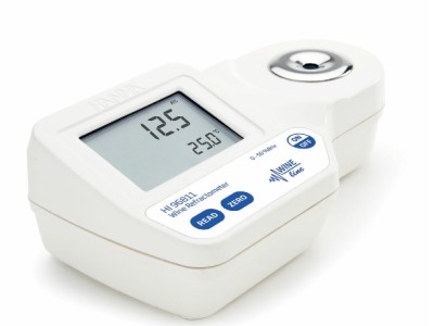 HI96811 將折光率轉(zhuǎn)化為以重量百分比為單位的蔗糖濃度,即%白利糖度(又稱為°Brix)。該轉(zhuǎn)換的理論依據(jù)是國際食糖統(tǒng)一分析法委員會用書中提供的糖類分析方法。由于葡萄汁中的糖類多是果糖和葡萄糖并無蔗糖,因此這折光儀在測量葡萄酒時的糖度讀數(shù)又常常被稱為“表觀白利糖度”。
