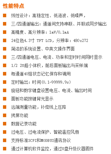 TH6400為全系列多路輸出的矩形電源,其電壓電流精度分別達(dá)1mV和0.1mA。通道間串聯(lián)、并聯(lián)、同步輸出自由組合。在同步模式下,改變其中一個(gè)通道的設(shè)定值,其他同步的通道也將按比例隨之自動(dòng)變化。