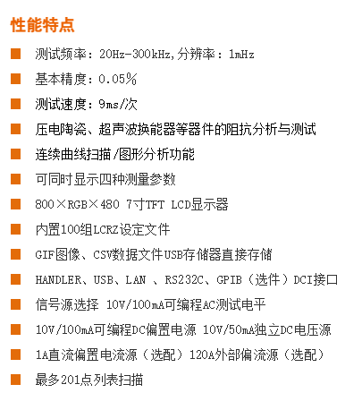 得益于新一代處理器的應(yīng)用,使儀器具有了更強(qiáng)大的數(shù)據(jù)處理能力,可將測(cè)試結(jié)果方便地存儲(chǔ)于U盤或通過(guò)多種接口上傳至上位PC或網(wǎng)絡(luò),推進(jìn)測(cè)試自動(dòng)化,提高測(cè)試效率。本系列測(cè)試頻率最高為:20Hz-1MHz。具有0.05%的測(cè)試準(zhǔn)確度、9ms/次的最高測(cè)試速度。儀器配有HANDLER、USB、LAN、RS232C 、DCI、GPIB(選配)等豐富的接口,無(wú)不彰顯豐富的資源,將帶給客戶較好的性價(jià)比體驗(yàn)。