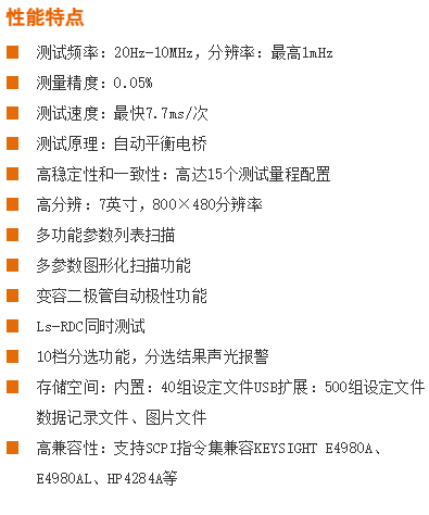 測(cè)試參數(shù) | Cp-D,Cp-Q,Cp-G,Cp-Rp Cs-D,Cs-Q,Cs-Rs Lp-D, Lp-Q, Lp-G, Lp-Rp, Lp-Rdc Ls-D, Ls-Q, Ls-Rs, Ls-Rdc, Rdc R-X, Z-θd, Z-θr G-B, Y-θd, Y-θr Vdc-Idc | |||||||