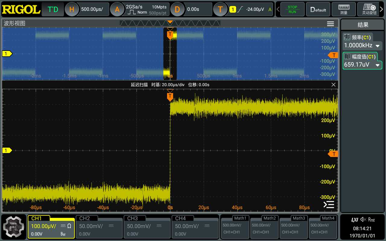 業(yè)內(nèi)領(lǐng)先的100μV/div垂直靈敏度檔位,μV級別的信號也能準(zhǔn)確測量。