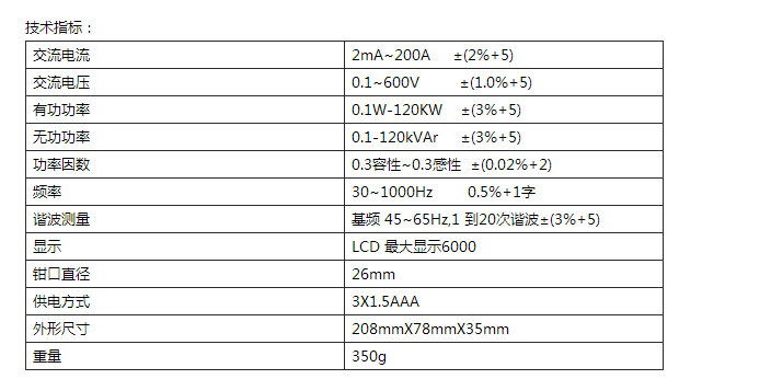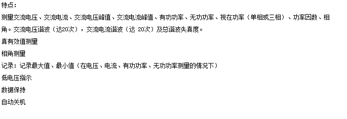 測量交流電壓、交流電流、交流電壓峰值、交流電流峰值、有功功率、無功功率、視在功率(單相或三相)、功率因數(shù)、相角。