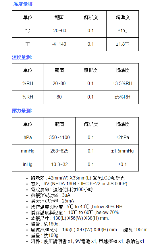 風(fēng)速0.4-25m/s(精2%),風(fēng)量0-9999CFM,99組記錄,風(fēng)溫-20—60℃風(fēng)濕20-80%RH(精3.5%)