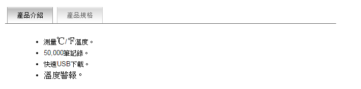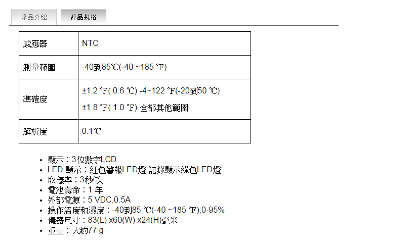 -40到85℃(-40 ~185 ℉),50,000筆記錄,快速 USB 下載,取樣率:3秒/次電池壽命︰1 年,帶警報