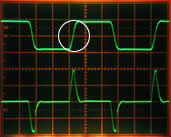 | 電 壓 5kV/div. 電 流 20mA/div. | 電容性負荷、恒電壓模式 4kHz/4kVpk輸出 | ←左面的圖形電壓波形的放大圖 |