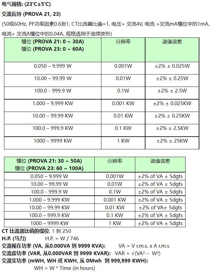 PROVA 21/23: AC交流瓦特最高可測9999KW: 2%基準(zhǔn)誤差