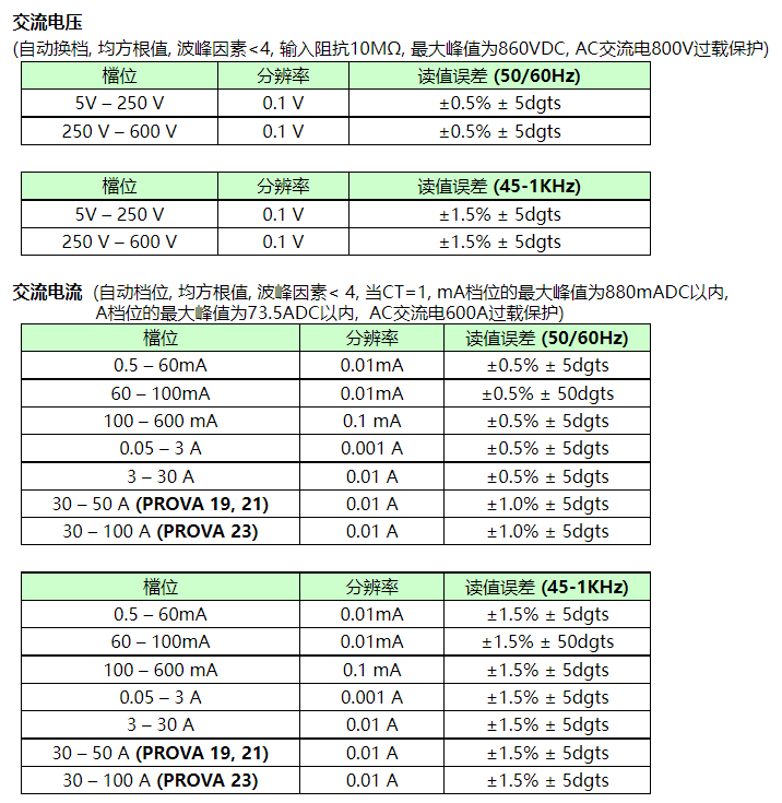 PROVA 19/21: AC交流電流 (均方根值) 最高可測50A: 0.5%基準(zhǔn)誤差