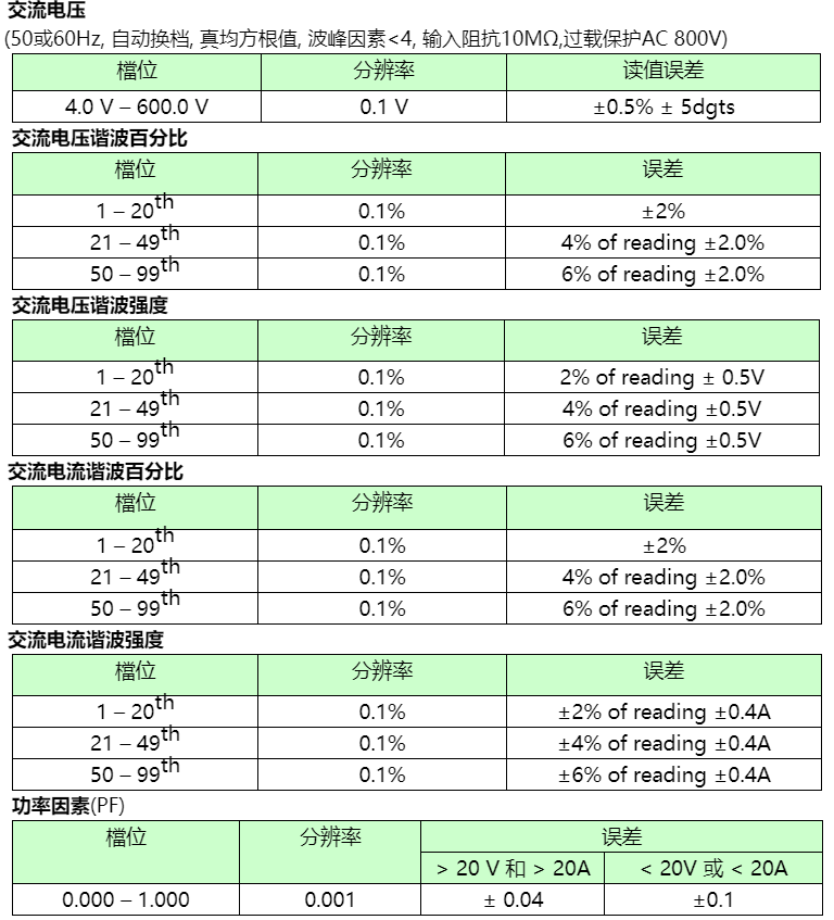 總諧波失真 (%THD-F) 以及波峰因素 (CF)。