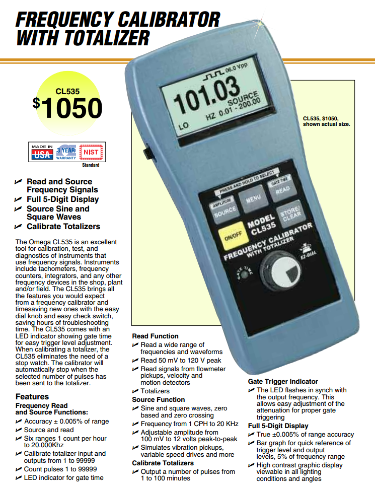The Omega CL535 is an excellent tool for calibration, test, and diagnostics of instruments that use frequency signals. Instruments include tachometers, frequency counters, integrators, and any other frequency devices in the shop, plant and/or field. The CL535 brings all the features you would expect from a frequency calibrator and timesaving new ones with the easy dial knob and easy check switch saving hours of troubleshooting time. The CL535 comes with an LED indicator showing gate time for easy trigger level adjustment. When calibrating a totalizer, the CL535 eliminates the need of a stop watch. The calibrator will automatically stop when the selected number of pulses has been sent to the totalizer.