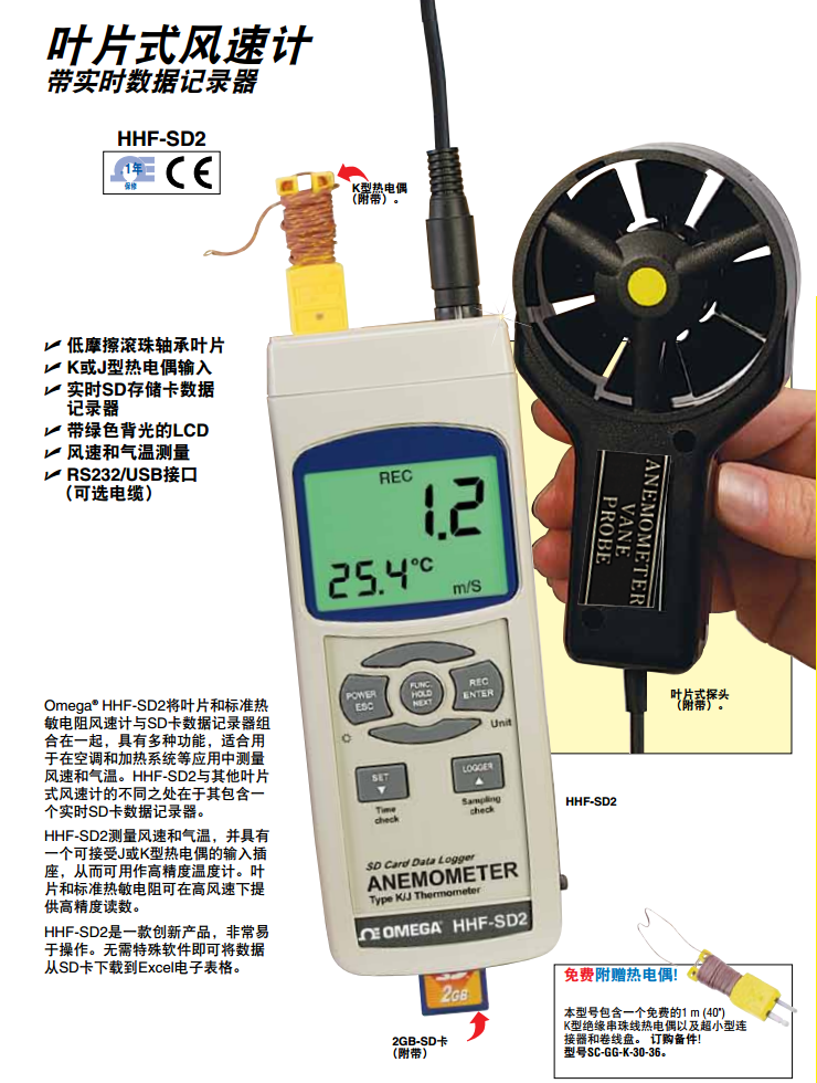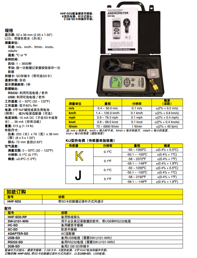 HHF-SD2測量風(fēng)速和氣溫,并具有一個可接受J或K型熱電偶的輸入插座,從而可用作高精度溫度計(jì)。葉片和標(biāo)準(zhǔn)熱敏電阻可在高風(fēng)速下提供高精度讀數(shù)。