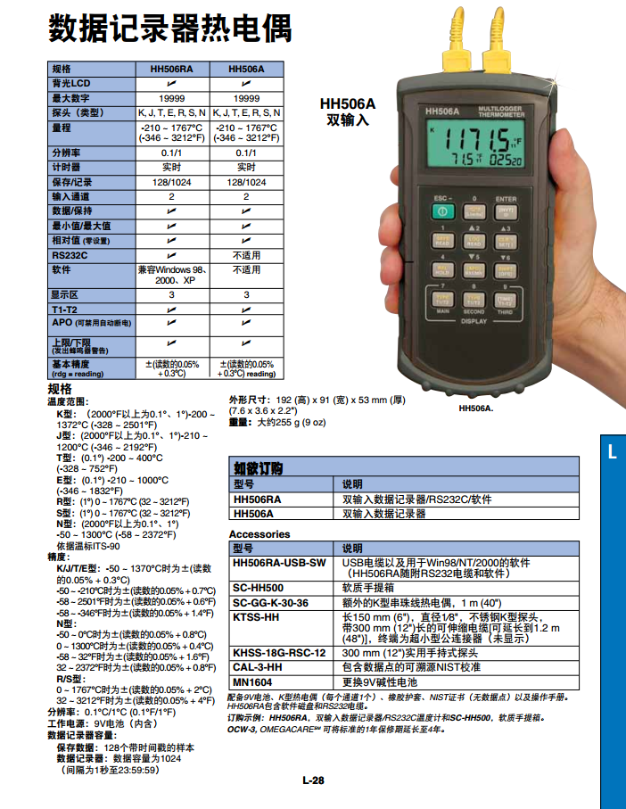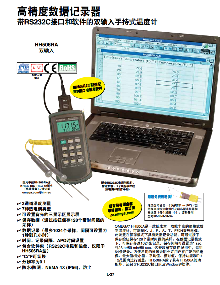 OMEGA? HH506A是一款低成本、功能豐富的便攜式數(shù)字溫度計,可測量K、J、R、S、T、E和N型熱電偶。此裝置在保存模式下具有數(shù)據(jù)記錄功能,可通過按下保存按鈕保存128個帶時間戳的采樣。在數(shù)據(jù)記錄模式下,可保存多達1024條記錄,保存間隔可設(shè)置為1 sec到23 hr/59 min/59 sec。這些數(shù)據(jù)存儲在16組中,每組64條記錄。方便易用的設(shè)置說明允許用戶在廣泛的熱電偶、大值/小值、平均值、相對值、保持功能和T1/T2范圍內(nèi)進行測量。HH506RA除了具有HH506A的功能外,還包含RS232C接口以及Windows?軟件。