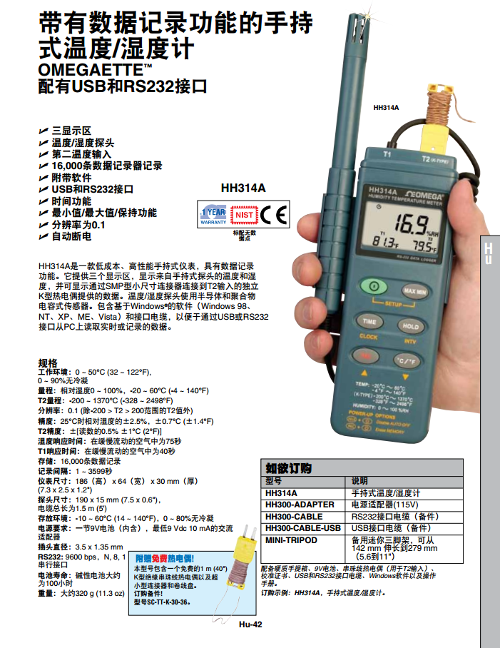美國omega 手持式溫度/濕度計 OMEGAETTE? 帶有數(shù)據(jù)記錄功能 配有USB和RS232接口
