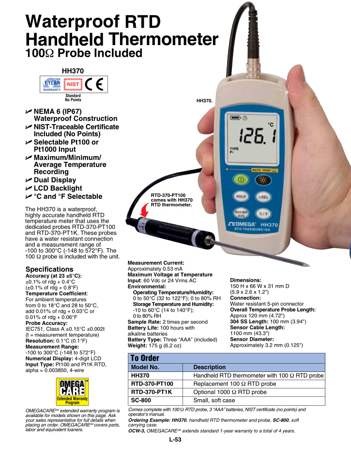 IP67 Waterproof ConstructionNIST-Traceable Certificate Included (No Points)Selectable Pt100 or P