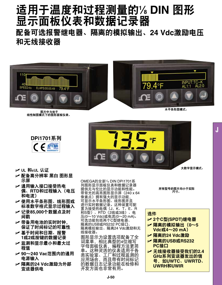 OMEGA的全新1/8 DIN DPi1701系列圖形顯示面板儀表和數(shù)據(jù)記錄器提供無與倫比的顯示功能和性能。帶背光的高亮圖形顯示屏(240 x 64 像素點)擁有強大的顯示功能, 可顯示水平條形圖、線形圖并且 進行實時數(shù)據(jù)記錄。這種裝置可配置為接受熱電偶(J、K、T、E、R和S型)、RTD(2線或3線)、電壓(0~10 Vdc)或電流(0~20 mA)。可選功能包括兩個C型繼電器、 隔離的USB或RS232 PC接口、 隔離模擬輸出、隔離24 Vdc激勵和無線接收器。