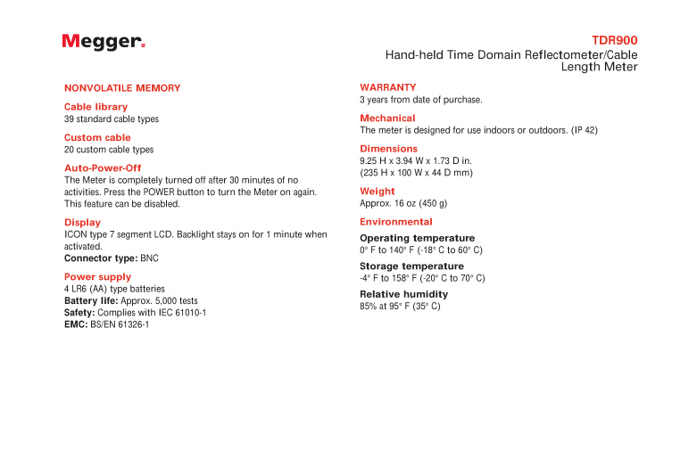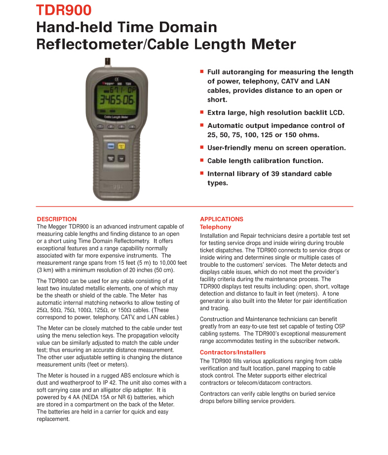 美國(guó)MEGGER 手持式時(shí)域反射計(jì)/電纜長(zhǎng)度表 TDR900