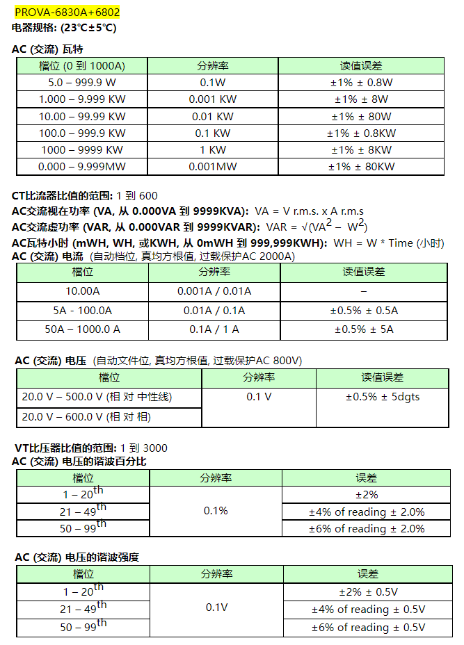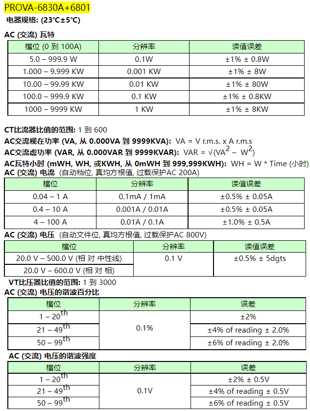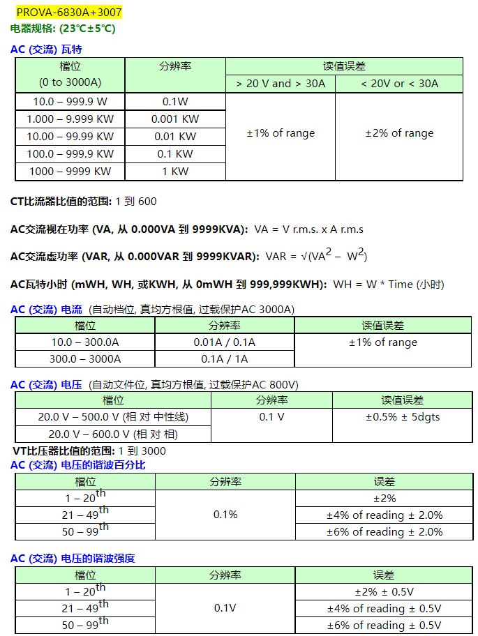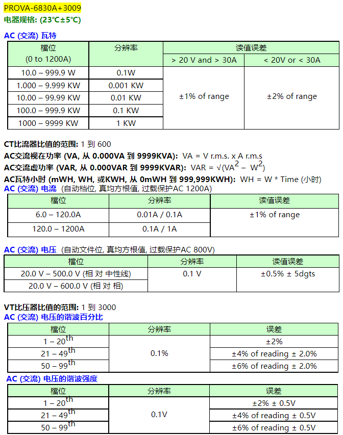 電流測量 (0.04A到6000A) 及電壓測量: 真均方根值 (True RMS), 自動檔位