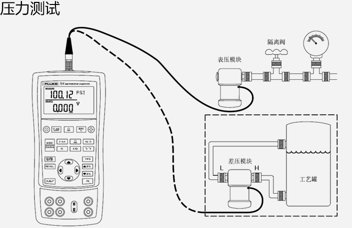 測量電壓、毫安、RTD、熱電偶、頻率、脈沖和電阻,以便測試傳感器和傳送器,輸出/模擬電壓、毫安、熱電偶、RTD、頻率、脈沖和壓力信號,以便校準(zhǔn)傳送器,使用 48 個 Fluke 750Pxx 壓力模塊