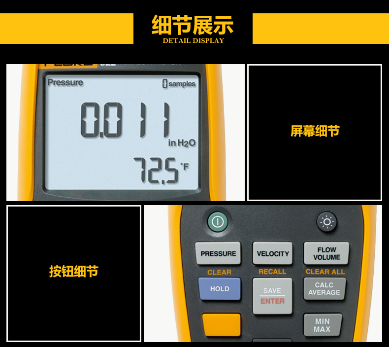 功能強大的空氣流量檢測儀,可以測量壓差、靜壓力、空氣流速和流量 ,方便的彩色軟管有助于正確識別壓力讀數(shù)