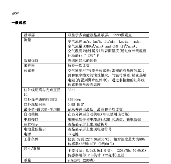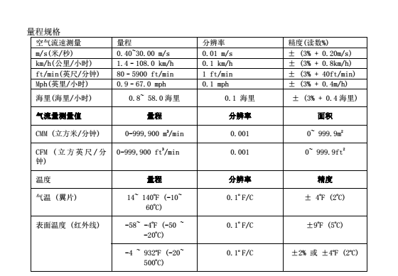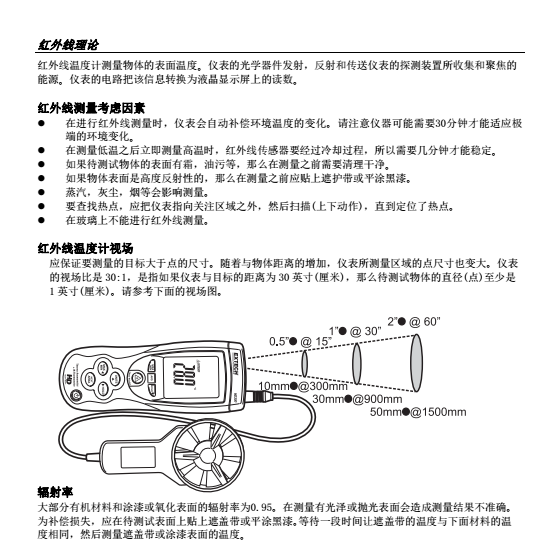 紅外測溫儀測量遠距離表面溫度至932°F(500°C),距離點距比為30:1,激光指示器 同時顯示CFM / CMM中的風量或風速加環(huán)境溫度