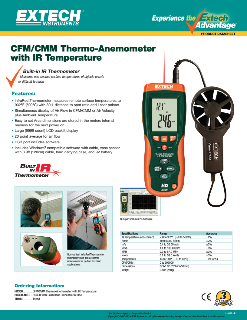 艾示科EXTECH HD300 內(nèi)置紅外溫度計的CFM / CMM溫度風速儀