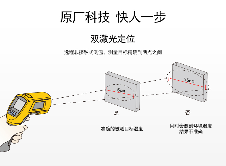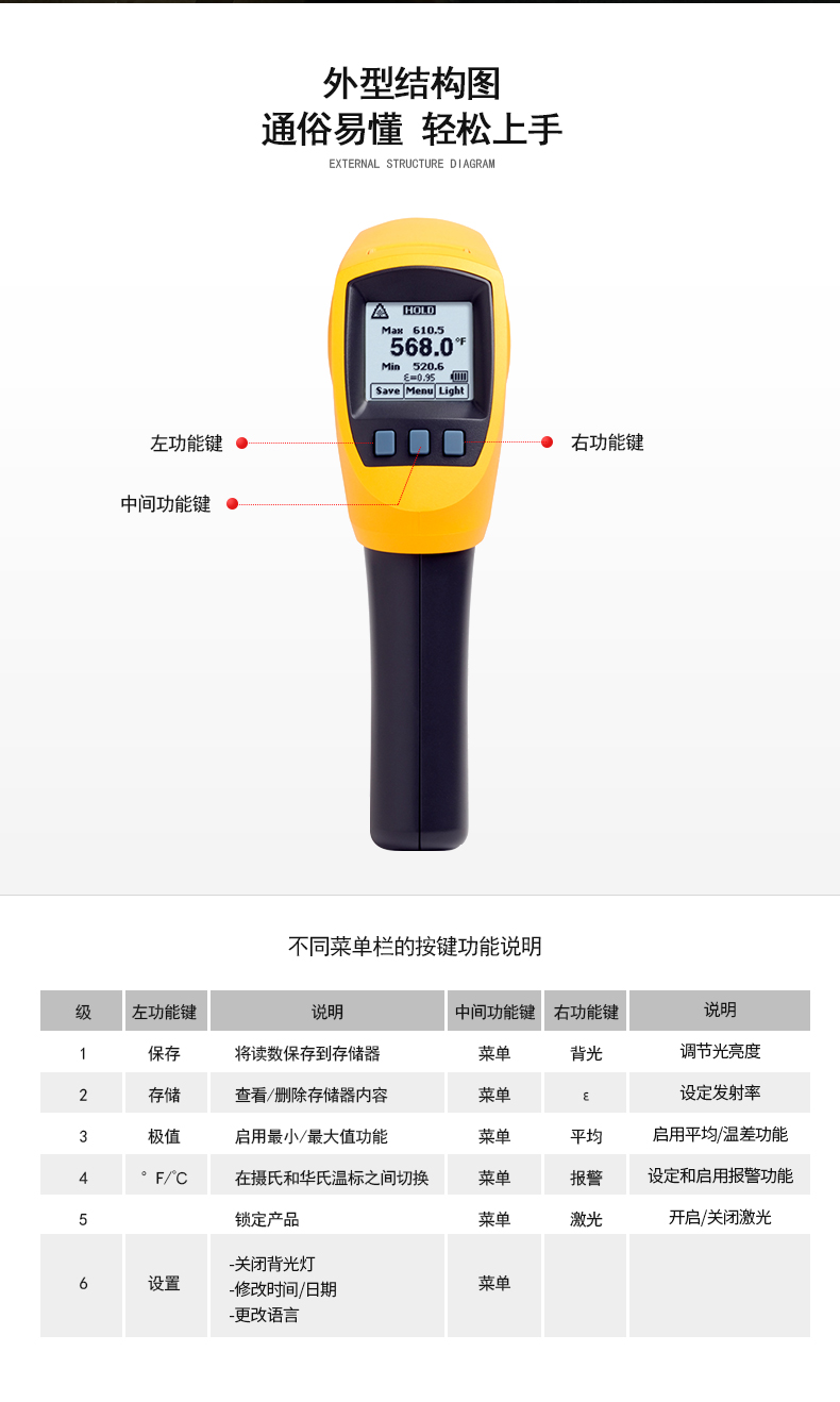 測(cè)量溫度范圍為 -30 °C 至 900 °C(-22 °F 至 1652 °F),60:1 的距離光點(diǎn)比以及雙激光瞄準(zhǔn)系統(tǒng),可以快速準(zhǔn)確定位目標(biāo),當(dāng)前溫度及大、小、溫差和平均溫度顯示