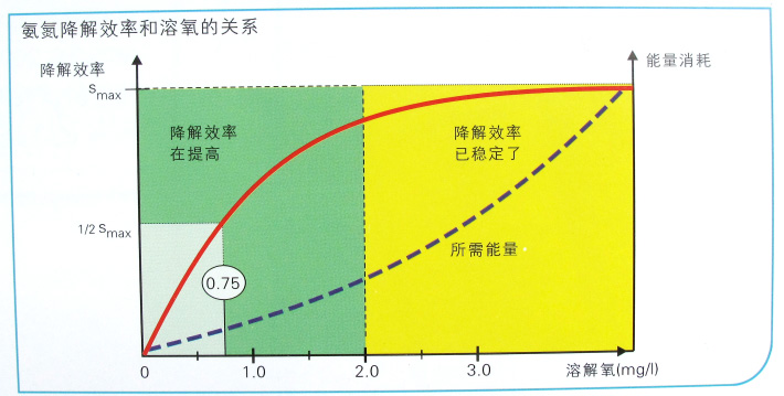 在有氧階段,硝化細菌把氨氮轉(zhuǎn)換成硝氮,溶氧數(shù)值大小會影響微生物的活性,合理的濃度在2mg/l,再高的溶氧并不能有效提高降解效率,鼓風機反而需要消耗更多的電能。下圖表示了在硝化除氮過程中溶氧跟降解效率的關(guān)系。從圖中可以看出溶氧保持在0.75-2mg./L之間最經(jīng)濟有效。在厭氧階段,污泥中殘留的溶氧不利于反硝化過程,所以溶氧要盡可能的低。